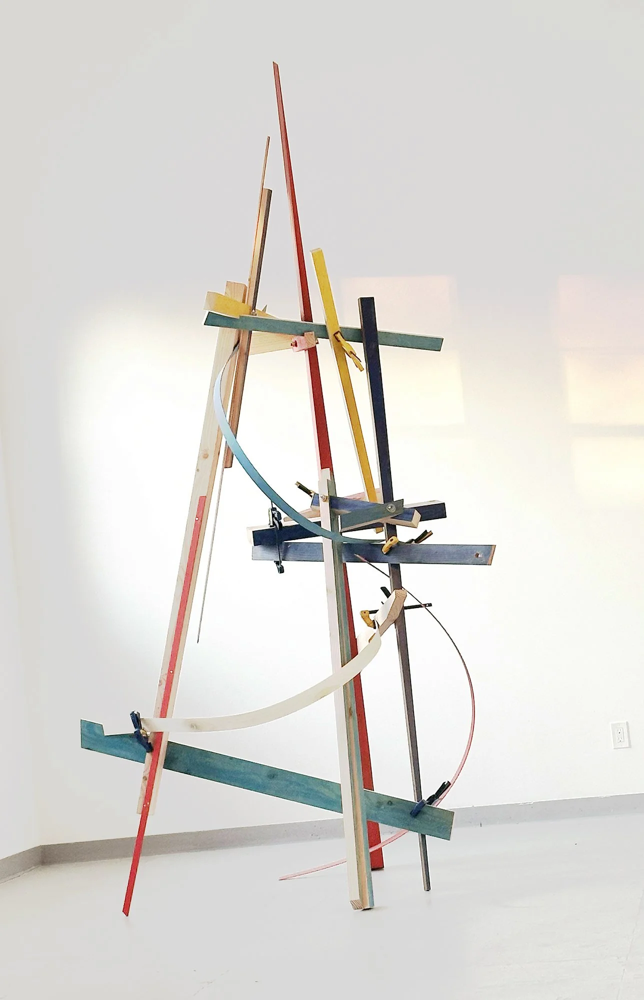 Kurt Steger, Nexus, 2025, wood, yellow pigment, twine, rebar, concrete base, 22 x 13 x 3 ft