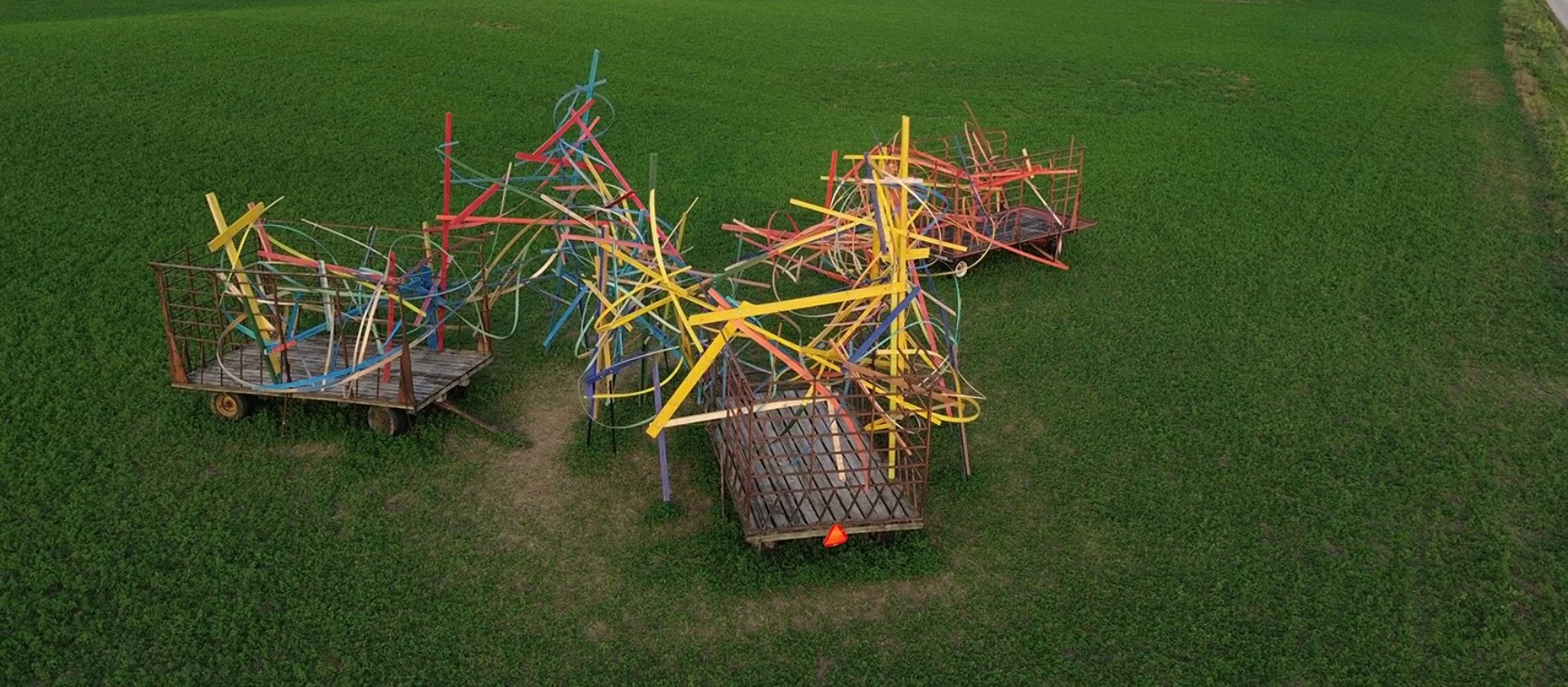 Jongil Ma, Earth, Wind and Sky, 2024, Three Hay Wagons, Fence Posts, Wood, Metal Fasteners, 60 x 78 x 25 ft