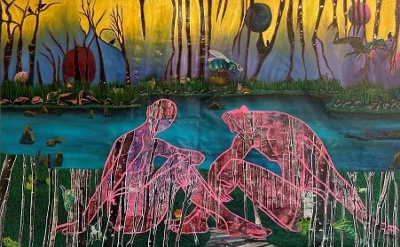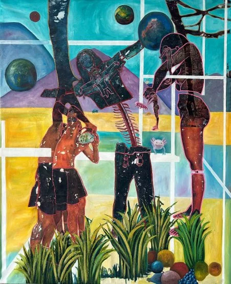 Her compositions often feature distorted or partially obscured figures, rendered in pink to avoid racial coding and instead evoke shared human vulnerability. She treats the body as a soft container of memory and emotional residue—something shaped as much by internal states as by its surroundings. Her process is largely intuitive, unfolding through layering, erasure, and interruption.