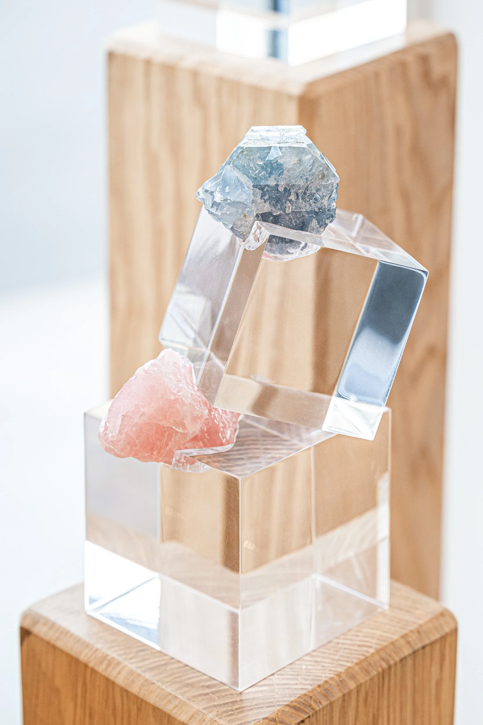 Tsuyu Bridwell, Pagoda XIX, Acrylic cubes, pink quartz, celestine, 4 cu in and 3 cu in