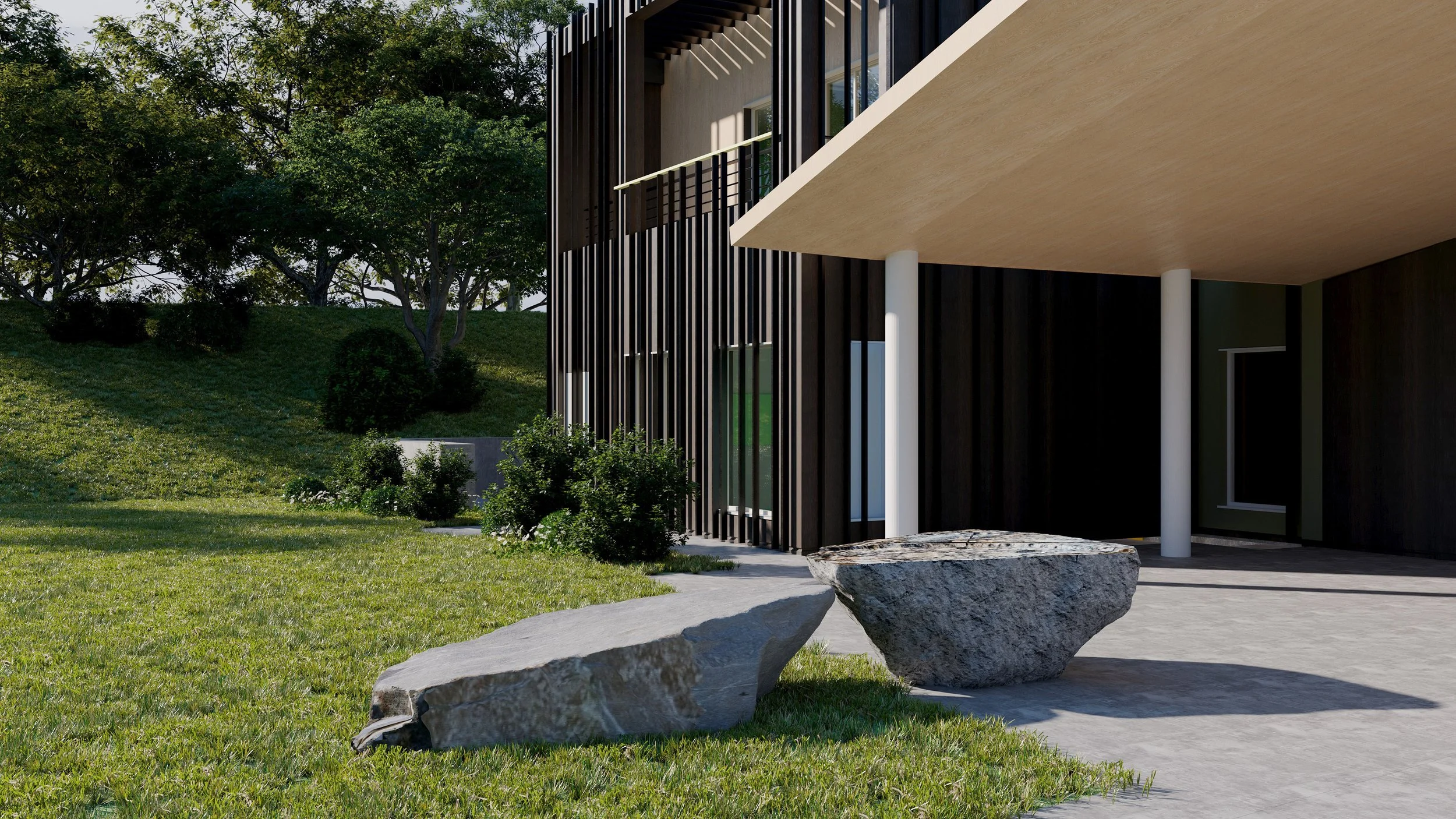 William Lamson, Water Offering, 2021-2025, Granite, Sculpture 1: 207 × 68 × 36 in, Sculpture 2: 106 × 114 × 396 in. Public Art Installation (Renderings) commissioned for the Queens Botanical Garden by the NYC Department of Cultural Affairs.