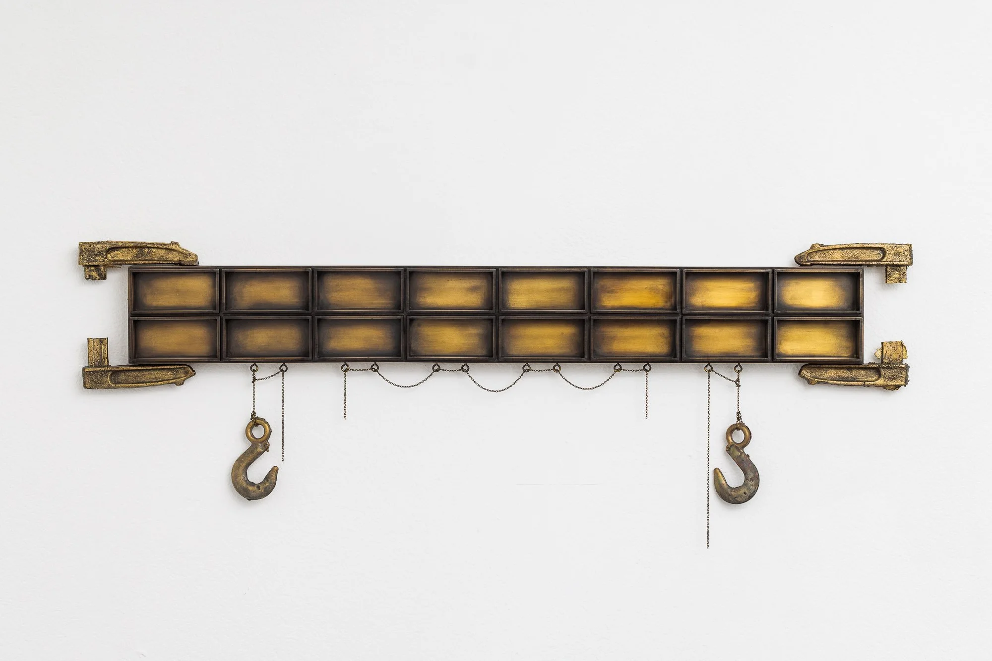Irina Lotarevich, Housing (Lottery), 2025, Galvanized steel, cast brass, cast aluminum, found chains, 64 x 37 1/2 x 6 1/2 in