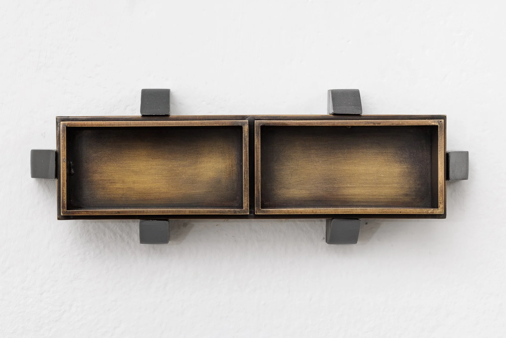 Working between Vienna and New York, Irina Lotarevich creates wall-mounted sculptures that explore her subjective experience within large bureaucratic systems. Through labored metalworking, she gives shape to the powerful yet intangible forces of capital that permeate and destabilize everyday life. The exhibition’s title, Indicators, refers to the quantitative tools used to predict fluctuations in the stock market.